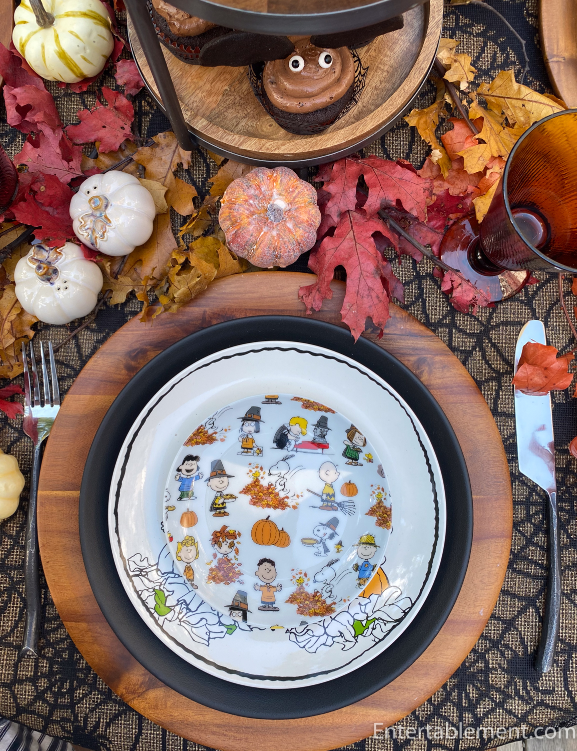 I noticed Pottery Barn has brought out Peanuts Harvest salad pates this year. That could be a fun table, too. Hmmm…wheels turning. Perhaps little turkey cakes…