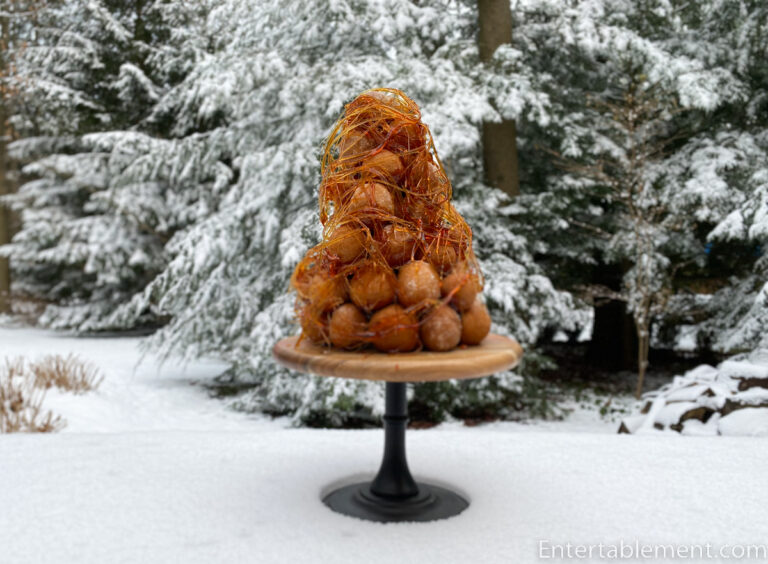 Swirls of spun sugar surround a tower of delectable treats, in this case, old-fashioned doughnut holes! Traditional croquembouche is made with small puffs of choux-pastry filled with pastry cream. This simplified version is just as pretty, with very little effort. Don’t be intimidated by the caramel; it comes together easily, made with only water and granulated sugar.