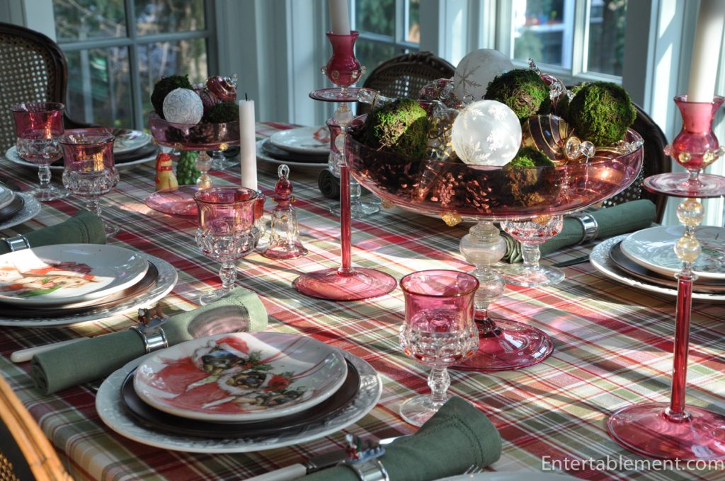The plaid tablecloth features rosy red, warm yellow and sage green, which worked well with the plates. I chose pink for all the glassware, starting with the antique Venetian glass set, comprising a large footed compote, two smaller footed compotes on glass plates and two tall candlesticks.