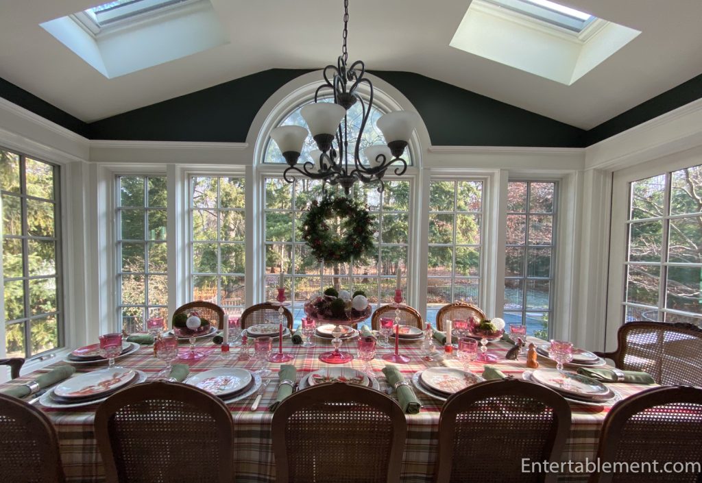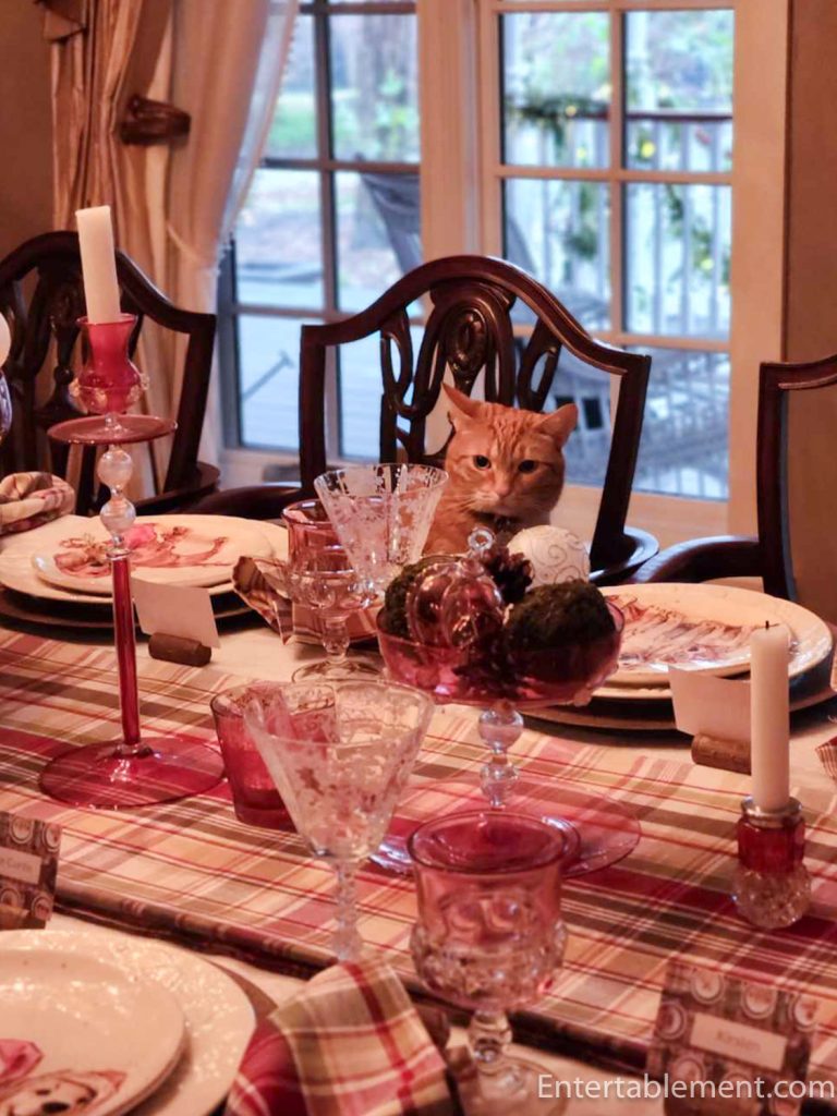 The decision was made that this was “the table” for Christmas 2023; it was time to move it into the dining room. With two 24″ leaves, at 120″, the dining room table is much longer than the one in the kitchen. The tablecloth was not quite long enough. So, I folded it into a runner and placed it over a white tablecloth. Dundee provided moral support.