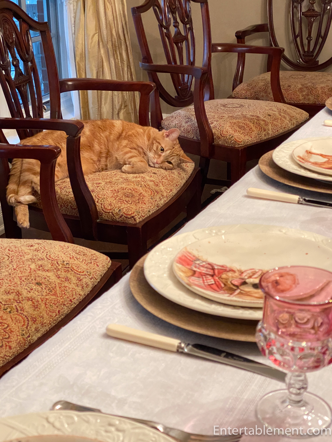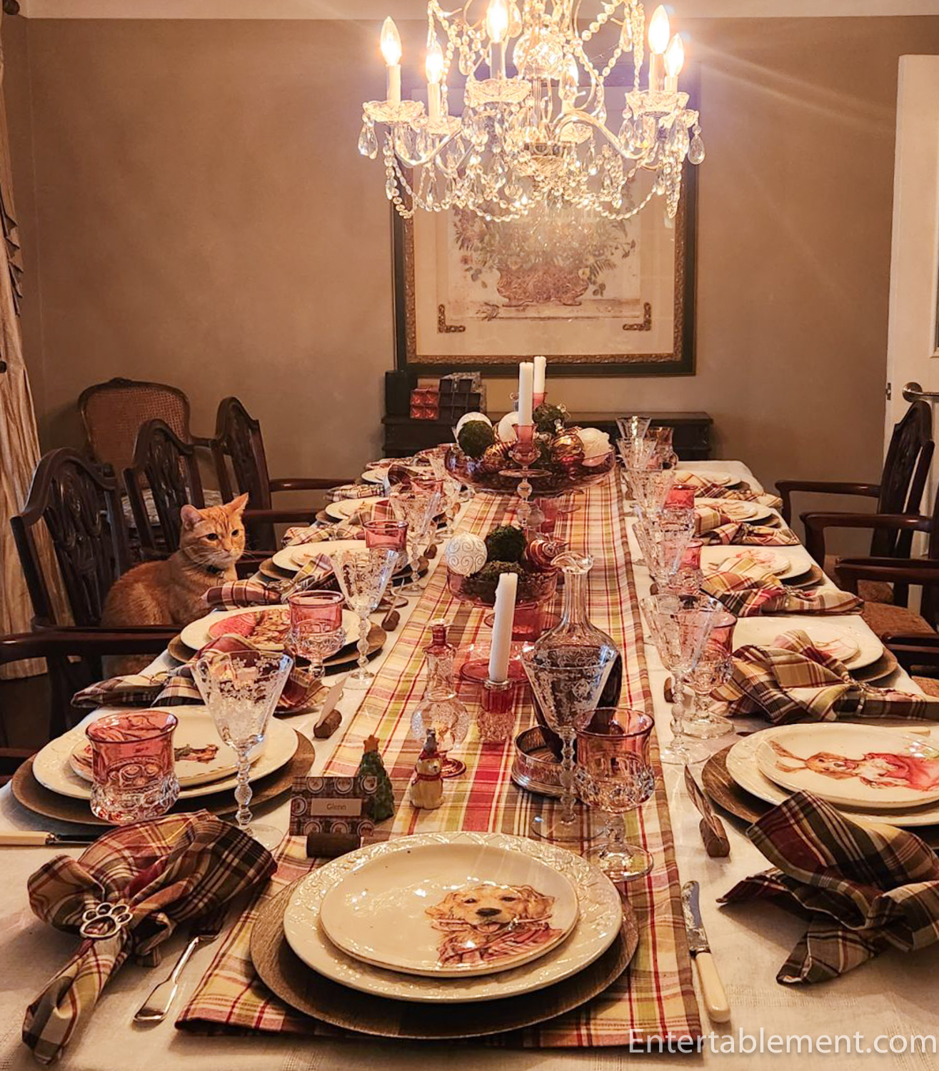 The decision was made that this was “the table” for Christmas 2023; it was time to move it into the dining room. With two 24″ leaves, at 120″, the dining room table is much longer than the one in the kitchen. The tablecloth was not quite long enough. So, I folded it into a runner and placed it over a white tablecloth. Dundee provided moral support.