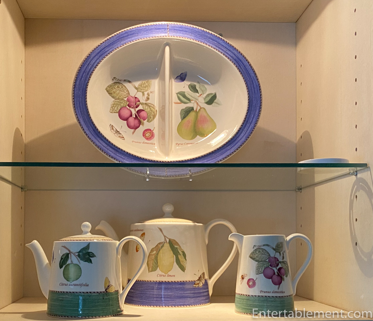 When I was placing the large platter, I noticed the brown transferware bowl containing the pears for the first time (only took a couple of decades…) and then noted that all the pieces had an element of brown edging.