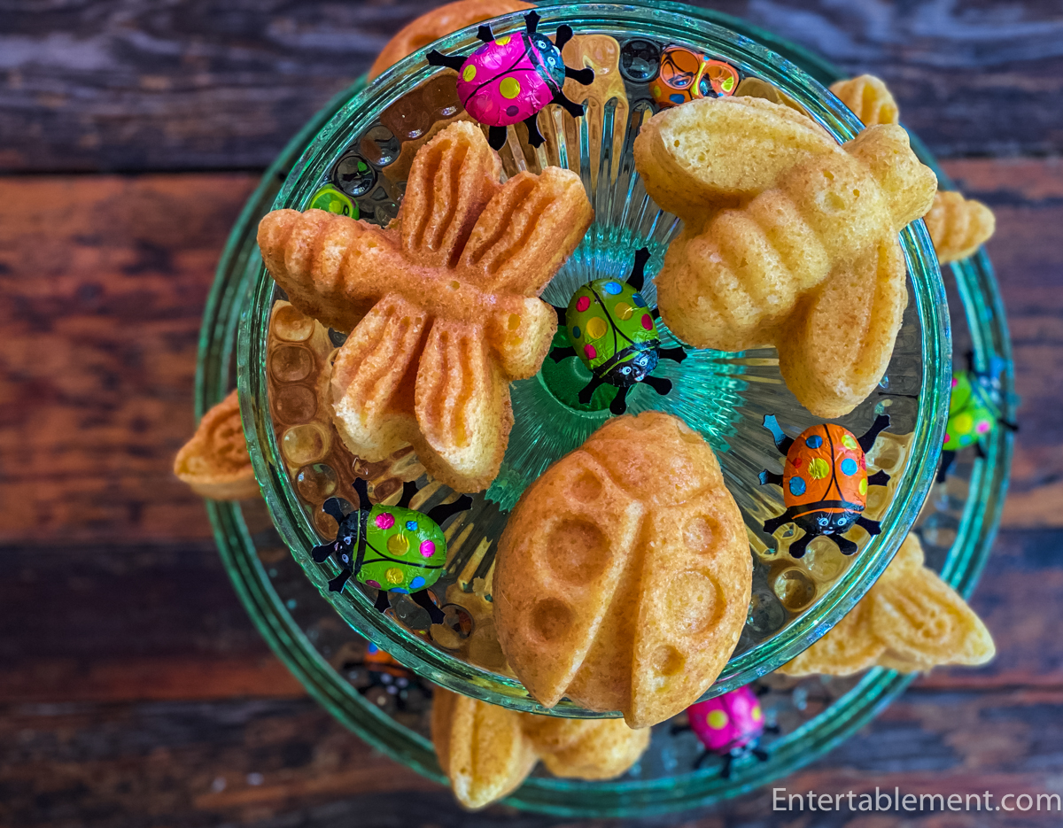 Back to our present table. I initially set this for Entertablement—Much Depends on Dinner and baked the Backyard Bugs Pound Cakes to go with it.
