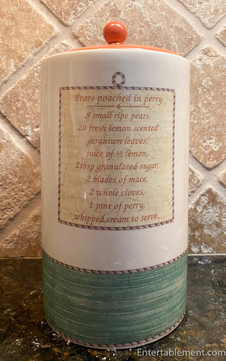 The green jar, which features pears on the front, gives an old-fashioned recipe for Pears poached in perry. I had to look that one up and discovered that Perry is a fermented pear juice, not called cider, as that term refers only to apples. But it’s the same principle.