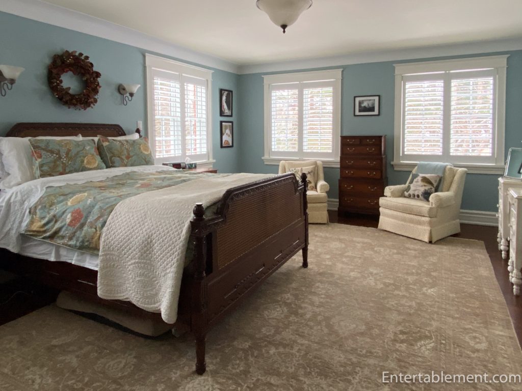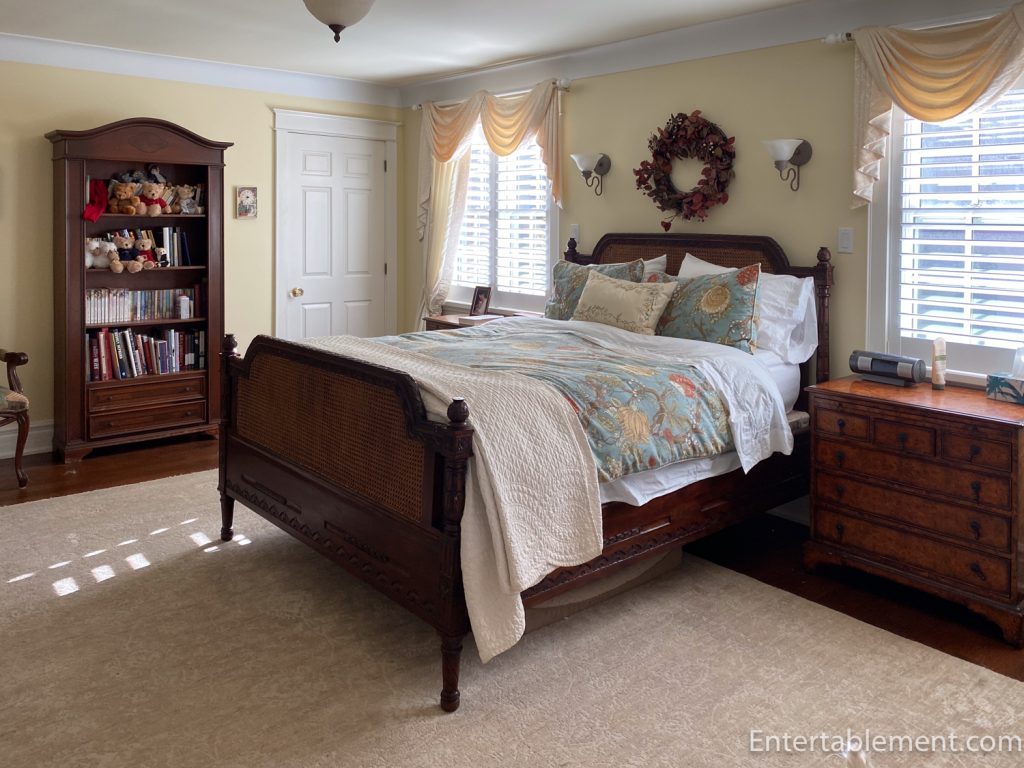 I was able to repurpose bedding and furniture from other areas of the house. The velvet duvet cover has been our master bedroom winter bedding for two decades. It’s held up amazingly well.