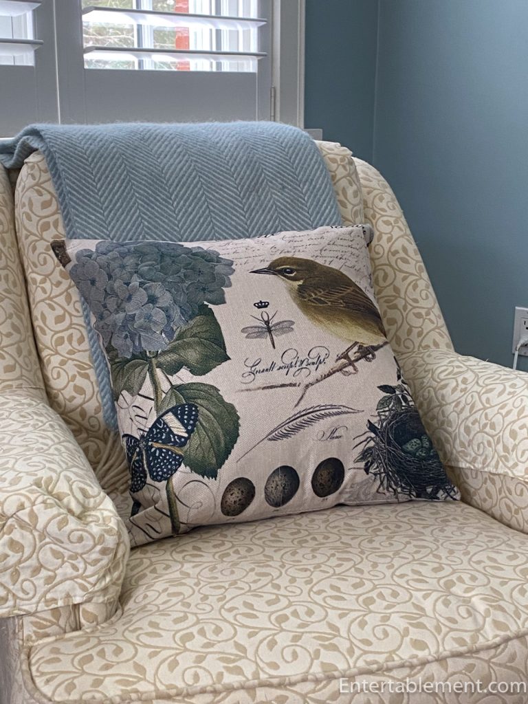 Again, I was able to move furniture around; these two chairs were originally in the family room. New accent pillow covers from Light in the Box work beautifully.