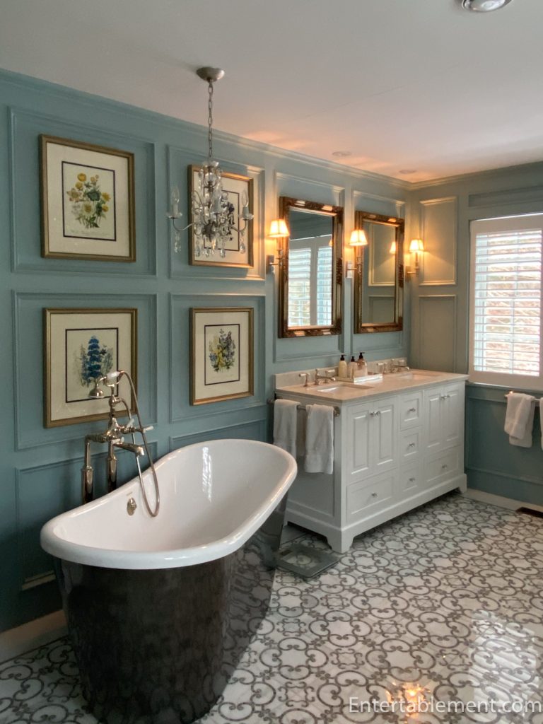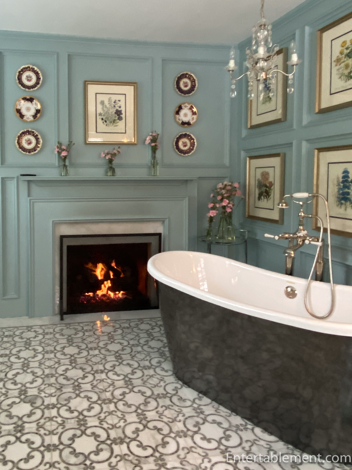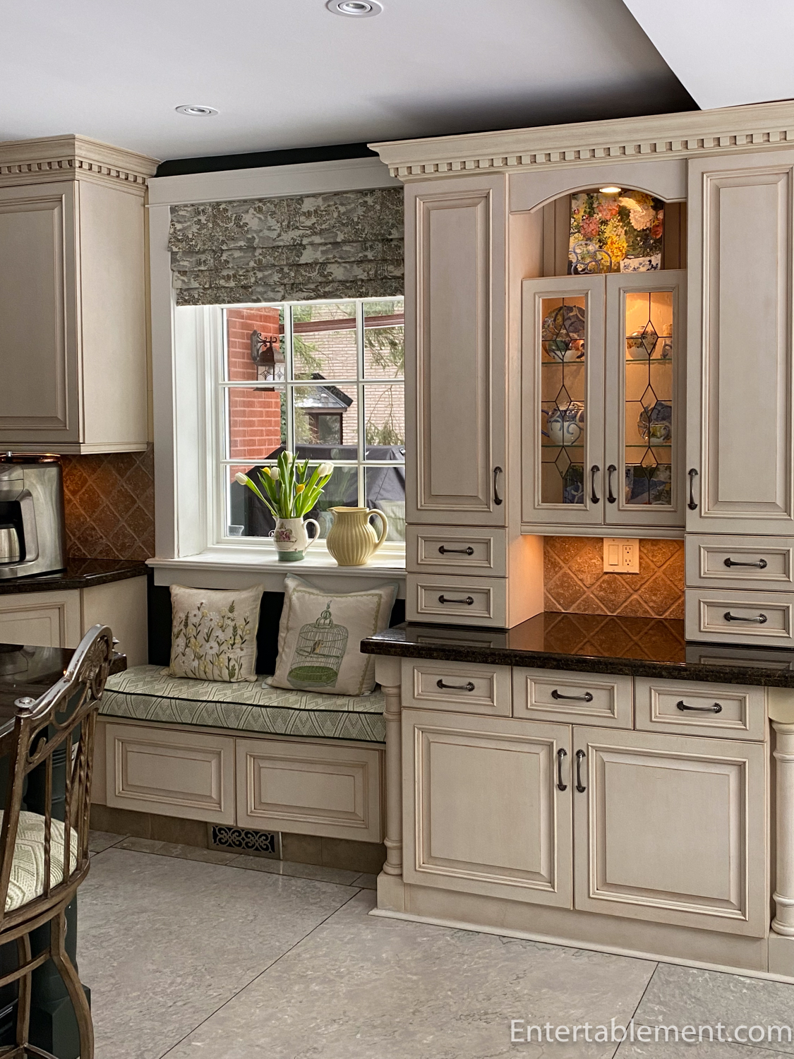 I LOVE all of this! Crazy about the mural in the powder room! So many nice “touches” like the window seat and roman shade make a big difference. Of course your live Golden Retriever and kitty “decor” is especially delightful!