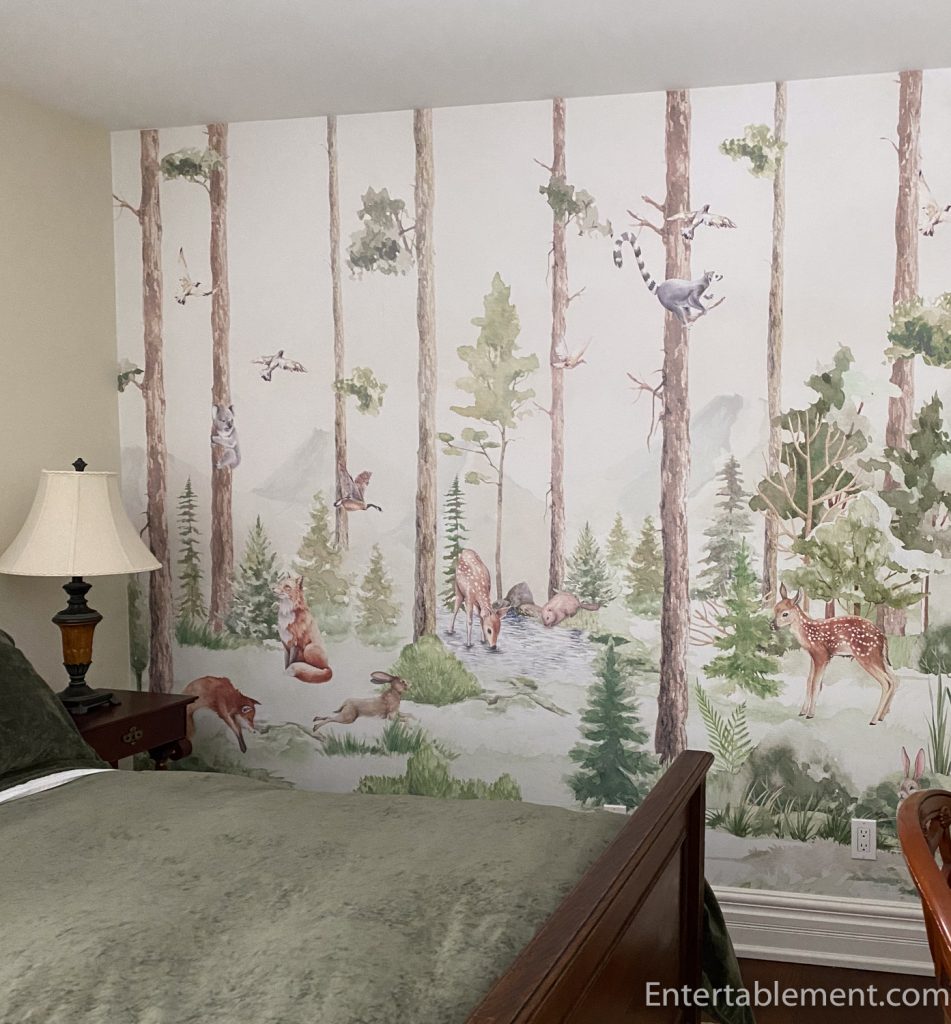 It was also time to refresh the “nursery” we had decorated when our first granddaughter, Maddie, was born. She’s now twelve, so Curious George was retired. All the girls are animal lovers, and another mural fits the bill. The girls are enchanted.