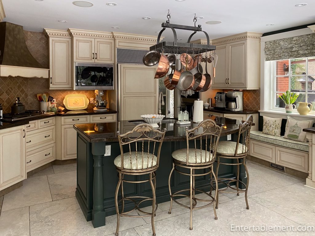 We also painted the island in the kitchen the same dark green. At some point, I may replace the black granite on the island with the same cream quartz we used for the island in the butler’s pantry. Thank you, 2GalsProPainting, who did an amazing job. In and out in 2 and a half days. Incredible.