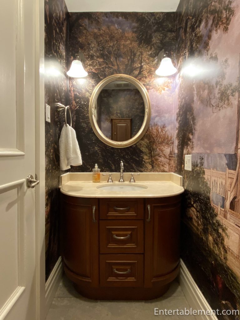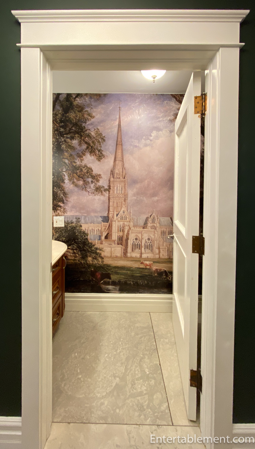 The Salisbury Cathedral mural wallpaper went into the powder room. I purchased two murals and attached them end to end. The room is 40″ wide and 100″ long, so two 140″ murals worked perfectly.