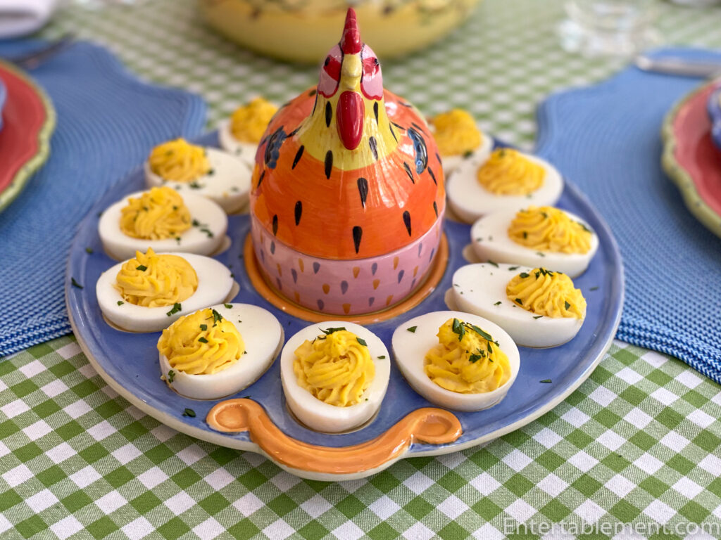 I love serving them on a deviled egg platter, like this one from the Pistoulet pattern from Pfalzgraff.