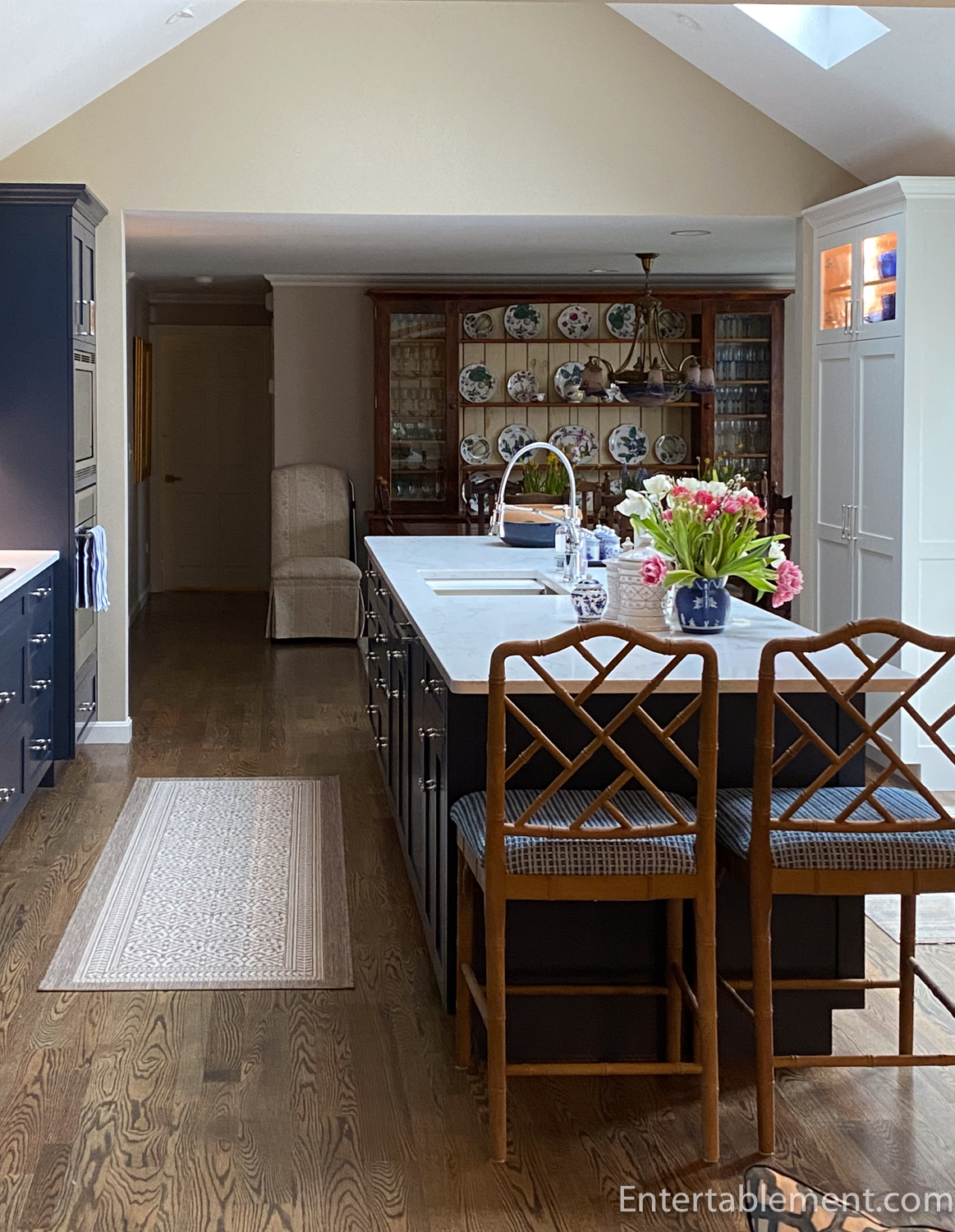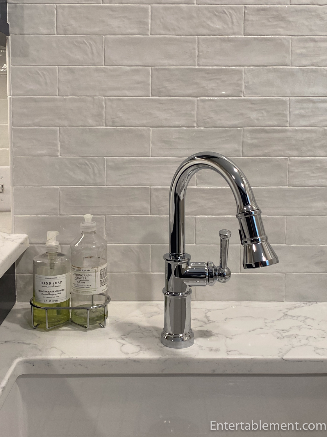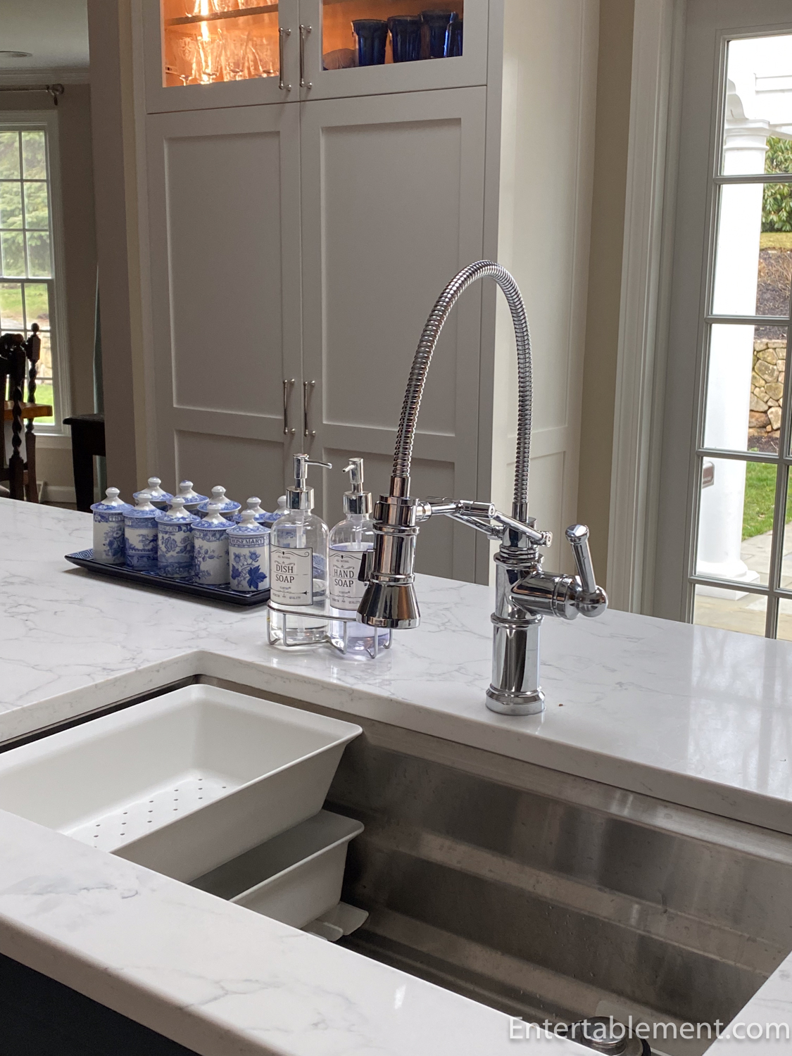 We put a Kohler Workstation sink on the island, which I love. Its three levels of “grooves” allow you to arrange the various racks and solid and perforated bowls into multiple positions as needed. Love, love it. I slide the solid bowl to the right, fill it with soapy water to wash up as I go along, and drain the items in the perforated bowl, which does double duty as a colander. Two racks sit in the bottom groove to hold plates or bulky dog bowls. It works beautifully. The Brizo Articulating faucet is by Litze. It has a lovely, solid feel to it. The best feature is the toggle from solid flow to spray, which allows a very soft, gentle spray if needed. So many faucets switch back to flow if the spray is not sufficiently strong.
