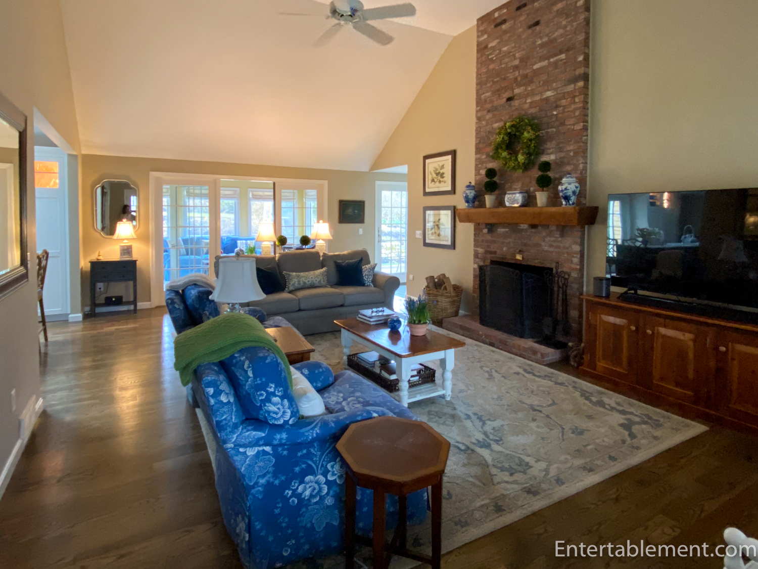 From this angle, it’s easier to see the French doors we installed where the kitchen sink had previously been. The sink is now in the (much extended) island, and the stovetop is on an inner wall, with a very efficient range hood above.