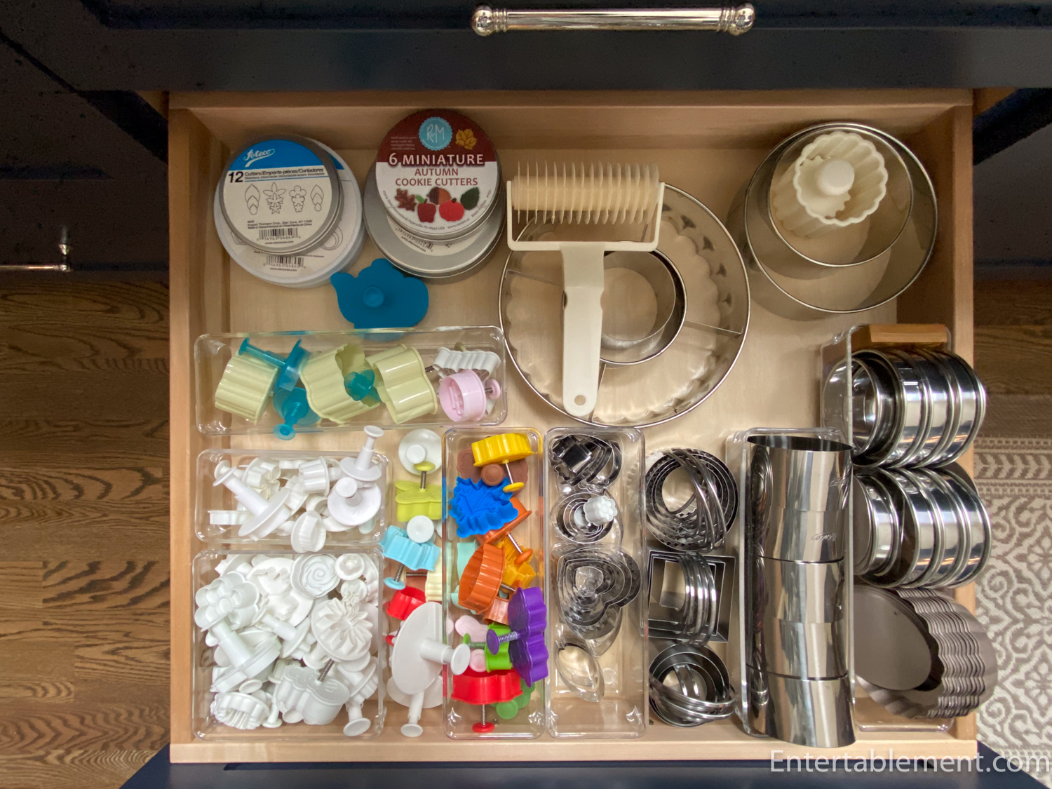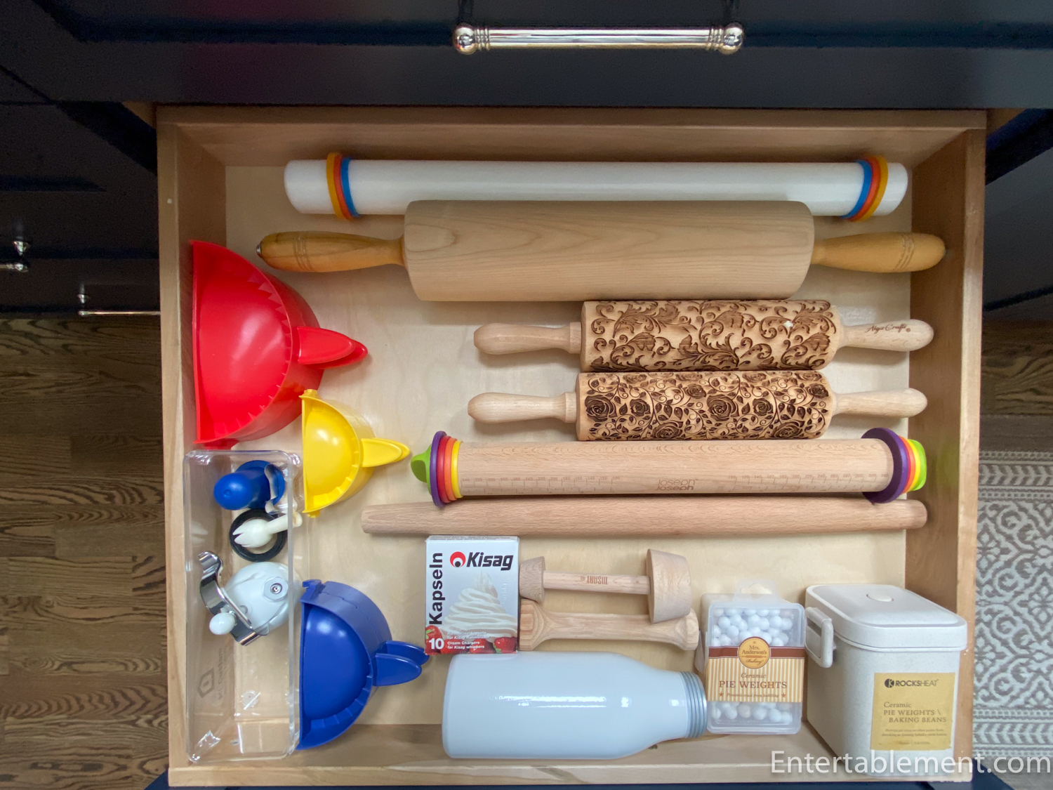 The dishwasher is to the right of the sink, and the cupboard to the right contains all my cutting boards, baking sheets and cast iron griddles. The drawer above contains cutlery. I debated putting the knives there, but they don’t go in the dishwasher, so having the more frequently washed forks, knives and spoons in that drawer made more sense.