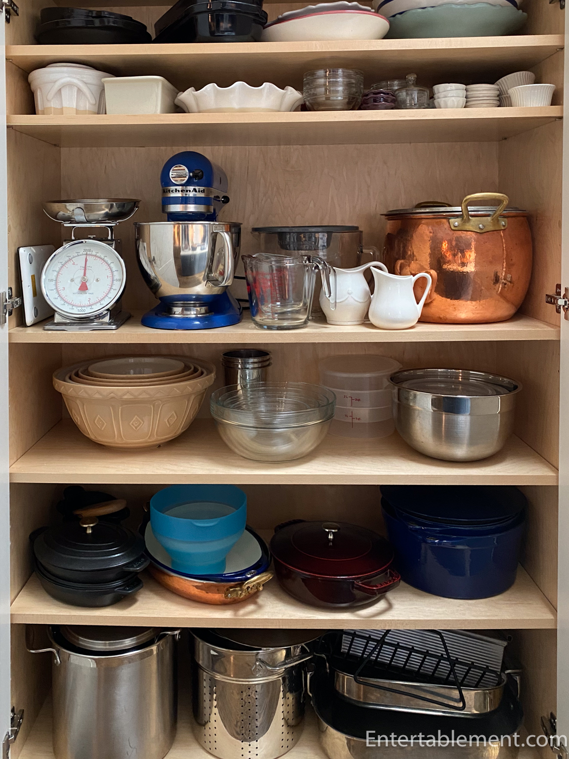The pantry cupboard directly across the island holds all my pie plates, cast iron braisers, glass, ceramic and stainless mixing bowls, mixer, scales, large pots and roasting pans.