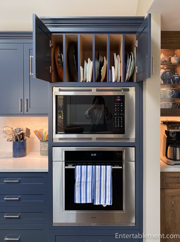 A cupboard over the oven and microwave holds platters and my 17″ copper paella pan.