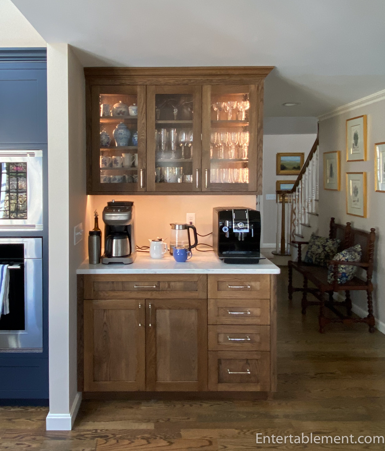 We installed a beverage bar to replace the corner cabinet in the dining room. Having a dedicated space for making coffee and tea or mixing a cocktail is lovely, as it keeps traffic out of the kitchen proper. We decided against putting a sink in, so we didn’t add a backsplash, but we did use the same countertops as in the kitchen.