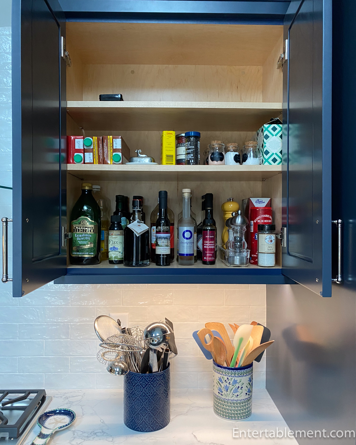 Though I designated the other end of the island, closer to the family room, for more “savoury” preparations, it made the most sense to have the oils, vinegars, salts and peppers in the cupboard to the right of the stove.