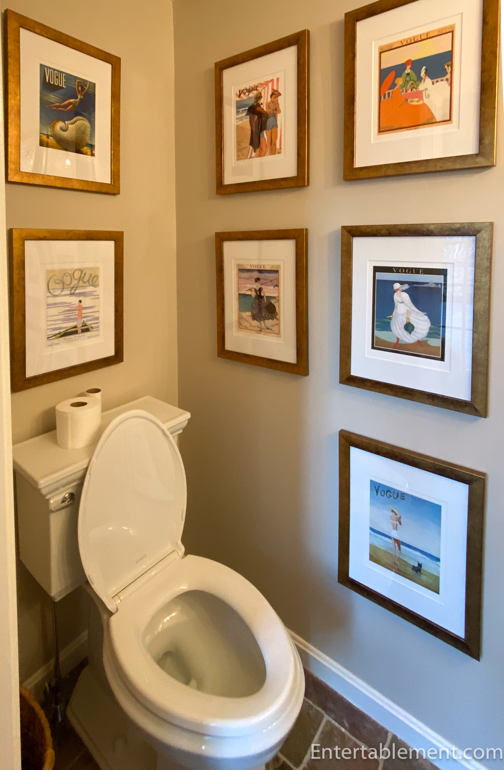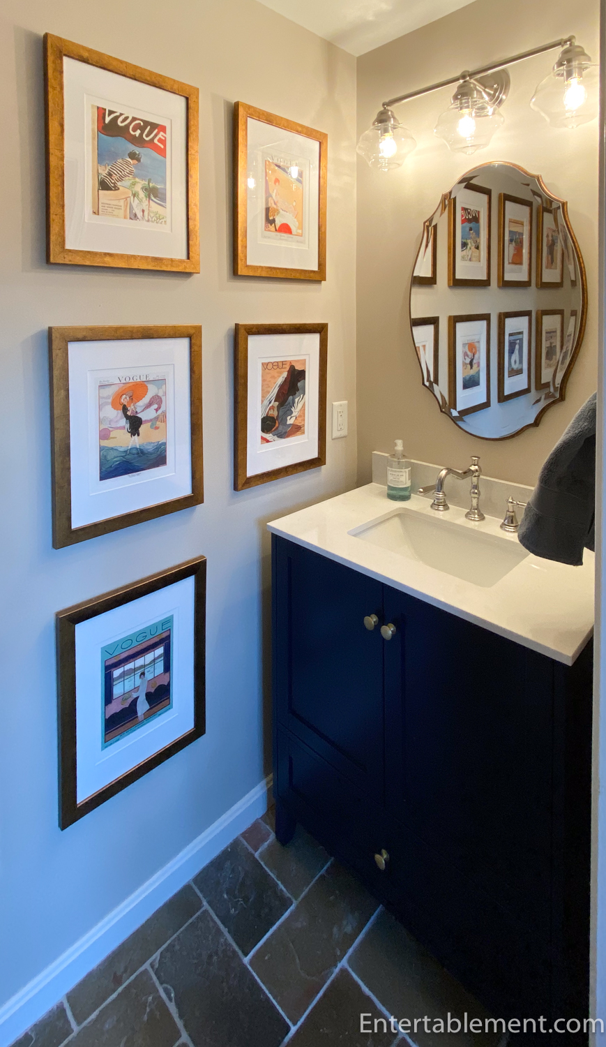 Mirror, light and vanity. Sorry for the quality of the photos; it’s a small space! I’ve had the Vogue magazine pictures since we bought the house. They feature beach fashions from the early part of the 1900s. I loved them, so I repainted the walls and rehung the pictures.