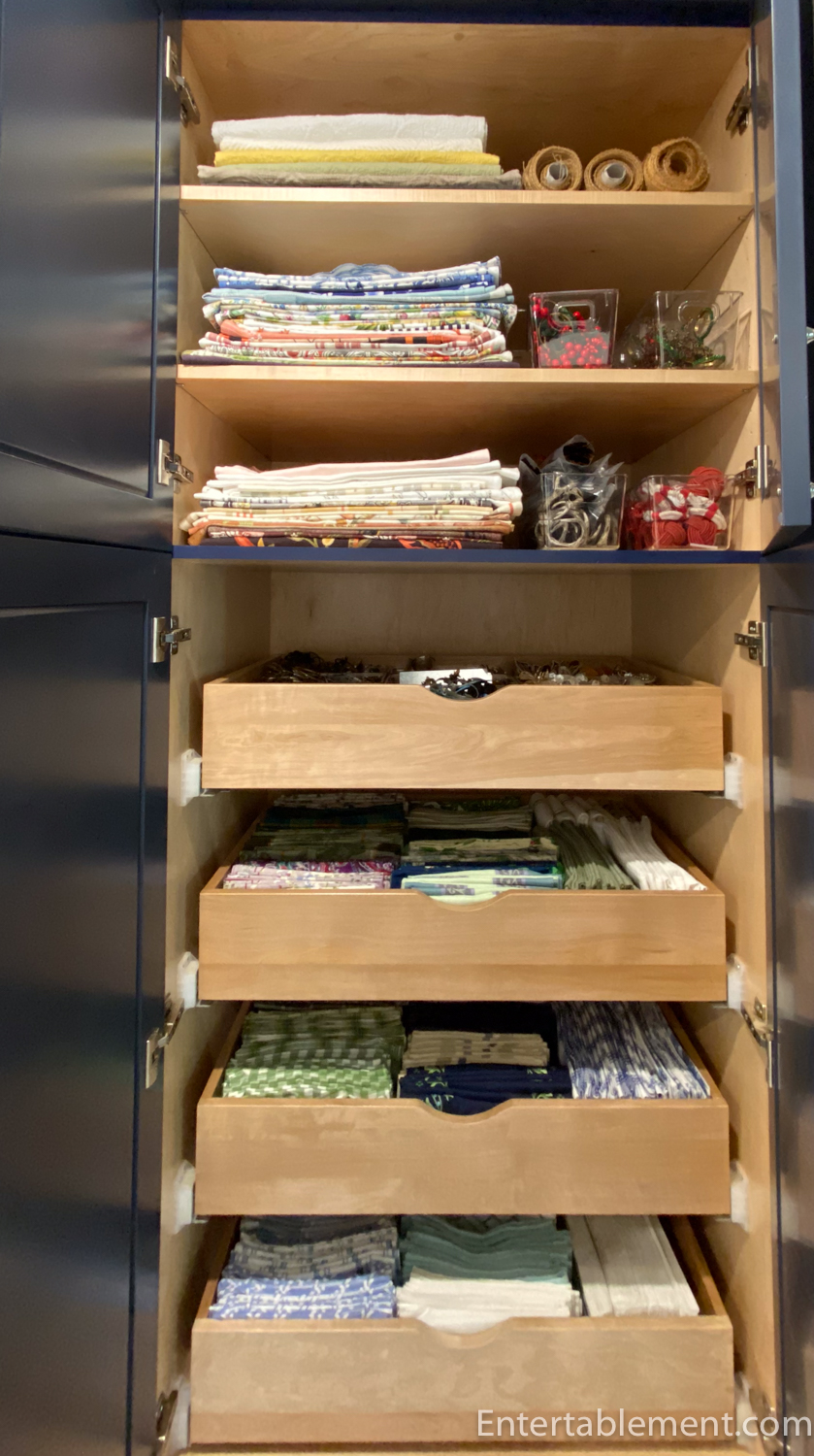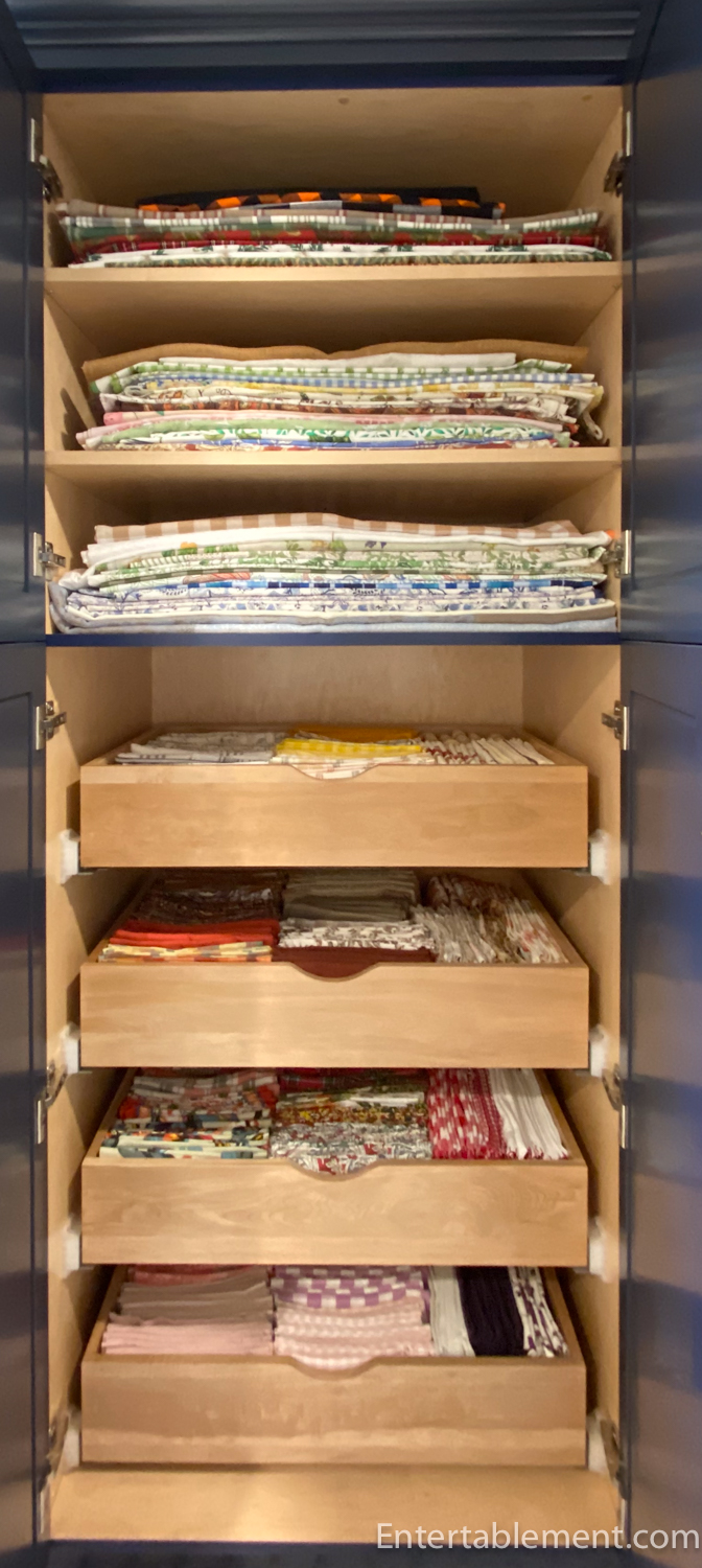 As long-time readers will know, I have a lot of linens. I stored them in innumerable lidded plastic containers inside the old linen cupboard in the former laundry room. Now, the napkins and napkin rings are in drawers; runners and tablecloths are on shelves. The cupboards are pretty deep, so the tablecloths can be folded very flat, which minimizes wrinkles.