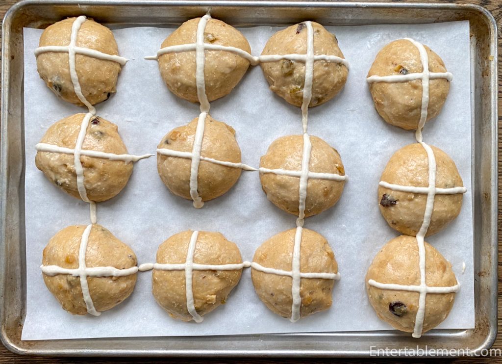 This recipe uses a flour paste to make the crosses and is applied before baking. You can skip this step and add the cross after baking with a confectioners’ sugar and water mixture if you prefer.