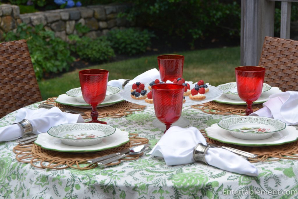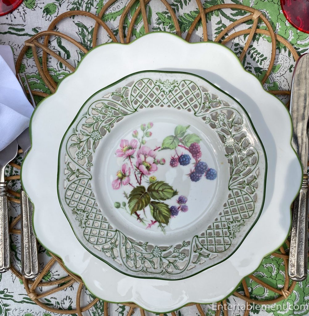 I have been severely remiss in commenting on your beautiful posts lately. I will reveal what we’ve been up to later. This lovely pattern I have never seen, and the reticulated edge gives additional delicacy. I also appreciate your picking up the red in the plates, echoing it in the tarts and goblets, and the greens in the cloth somehow do not spell Christmas.