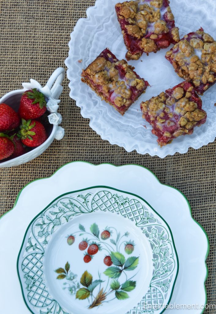 Rhubarb, another underappreciated old-fashioned fruit (though it’s actually a vegetable), is better known on both sides of the Atlantic. In desserts, rhubarb is frequently combined with strawberries. I made some Rhubarb Strawberry Bars, thinking I would use them on this table setting, but the tarts looked pretty on their own. Rhubarb also has excellent potential in savoury applications. Cooked with ginger, a little brown sugar and some pink peppercorns, it’s a delicious accompaniment to pork roast.