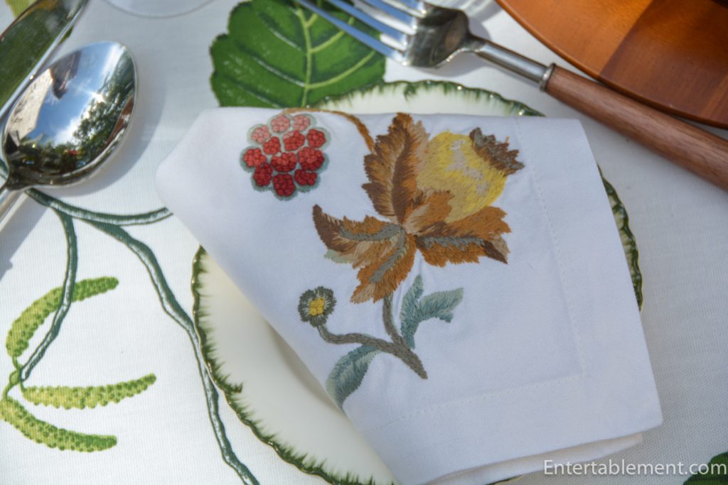 Years-old embroidered napkins by Pottery Barn reflect all the colours shown on the Indian plates. They are resting on Williamsburg Green Scalloped Edge bread and butter plates by Wedgwood.