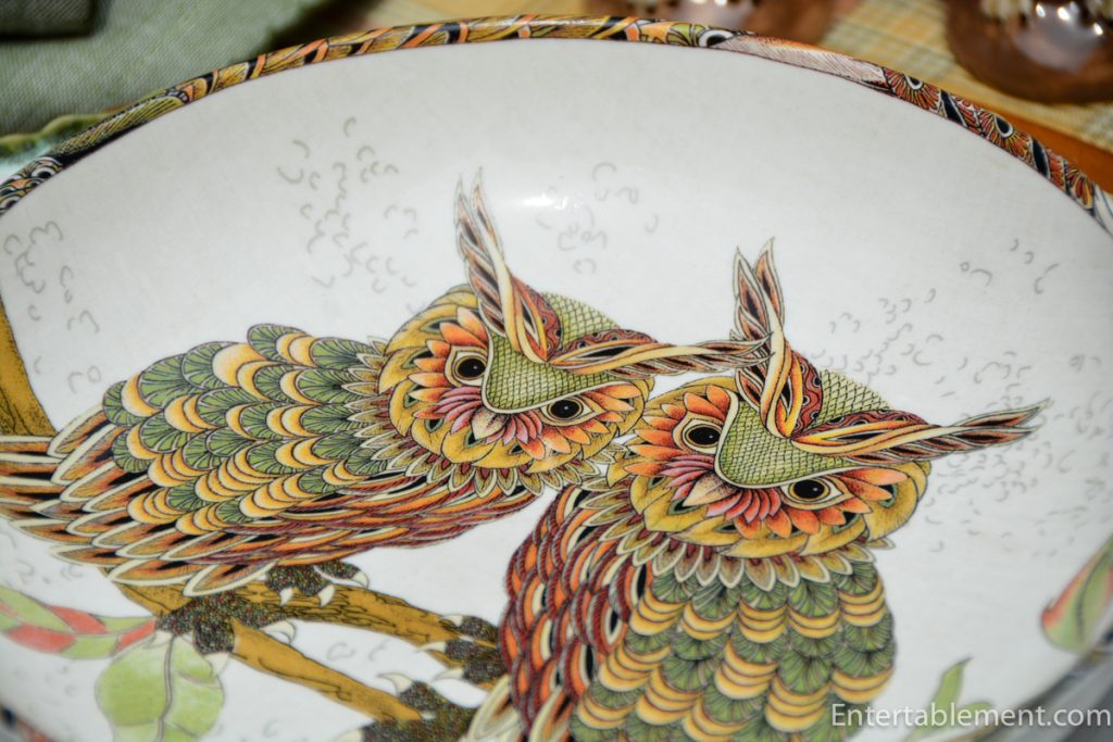 My tablescape in my formal dining room for October is also owls. Just a few S&P’s, napkins, and napkin holders. No plates. Yet. I…must…not…look…at…your…plates…I even took a little peek on Ebay for the William Sonoma collection, than closed the browser window immediately. I need another themed collection like a wack on the head. I need to satisfy my obsession by looking at your beautiful collection only!!!