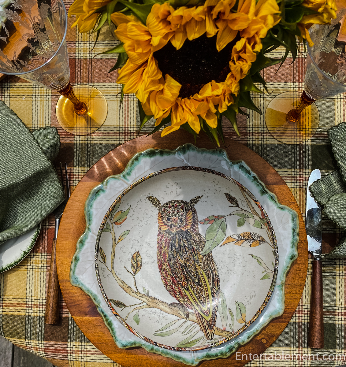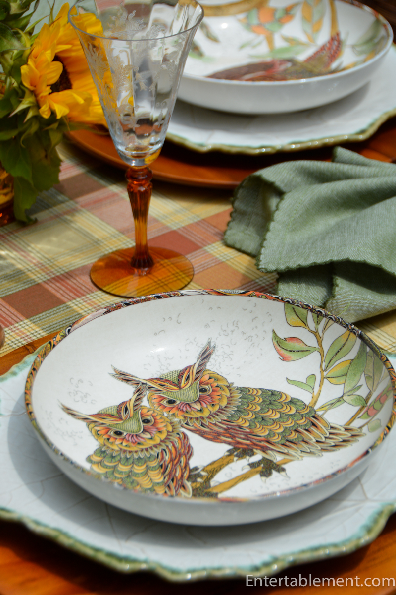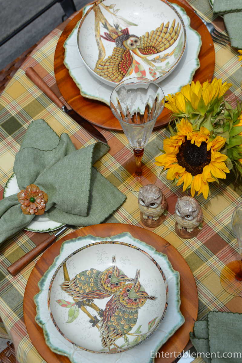 Underneath, I layered large Vietri leaf-edged plates and wooden chargers. The plaid tablecloth, in rust, gold, and mossy green, sets the perfect rustic tone—classic farmhouse meets woodland retreat.