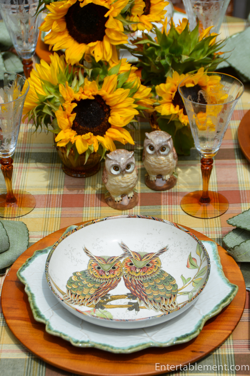 My tablescape in my formal dining room for October is also owls. Just a few S&P’s, napkins, and napkin holders. No plates. Yet. I…must…not…look…at…your…plates…I even took a little peek on Ebay for the William Sonoma collection, than closed the browser window immediately. I need another themed collection like a wack on the head. I need to satisfy my obsession by looking at your beautiful collection only!!!