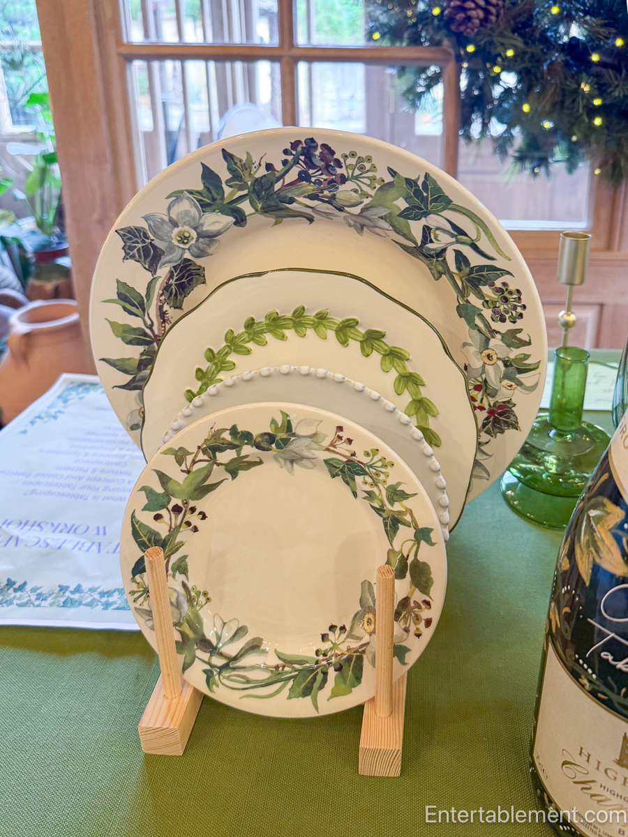 I very much like Emma Bridgewater’s “Ivy” pattern—the large dinner plate at the back and the small dessert plate at the front. The Ivy salad plate in between is from Primark at £8 a plate.