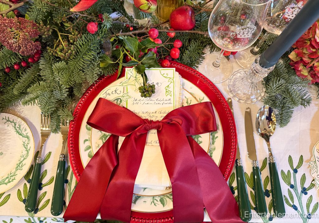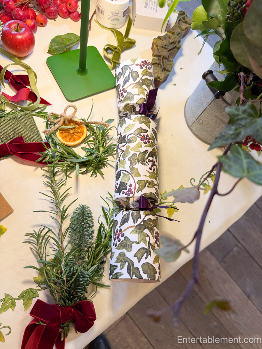 The workshop took place in Orchard House, one of Highgrove’s outbuildings used for public events. The room was brimming with Christmas charm — evergreens, twinkling lights, and lavishly styled tables. Think: vintage wood chargers, moss-lined vases, handmade crackers, and candlelight flickering against red velvet ribbon.