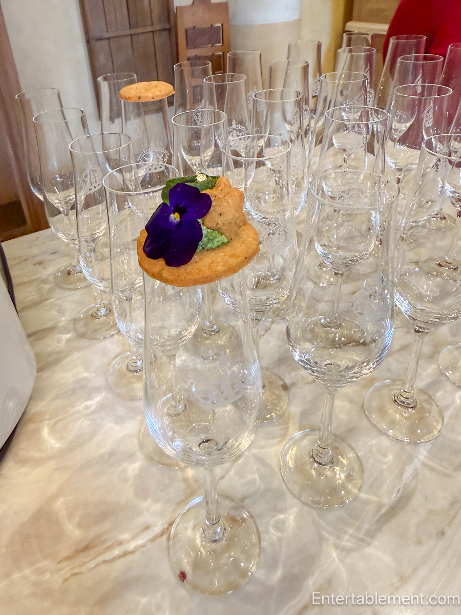 It’s a very flavourful Parmesan biscuit base, cut in a size just large enough to perch on top of the champagne glass. Kelley explained that a savoury bite, accompanied by a welcoming glass of champagne, gives a hostess about 20 minutes before the guests begin searching for more food. Just before the guests start to arrive, fill the champagne flutes, top them with the biscuits and then turn your attention to putting the finishing touches on the remaining canapés. Genius.