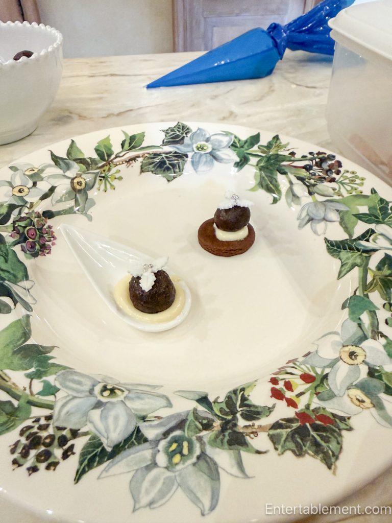 The second canapé was a deconstructed figgy pudding ball, garnished with a tiny fondant ivy leaf, sitting on a bed of brandy cream, perched on either a small chocolate biscuit base or atop a white ceramic spoon. Gorgeous and delicious.