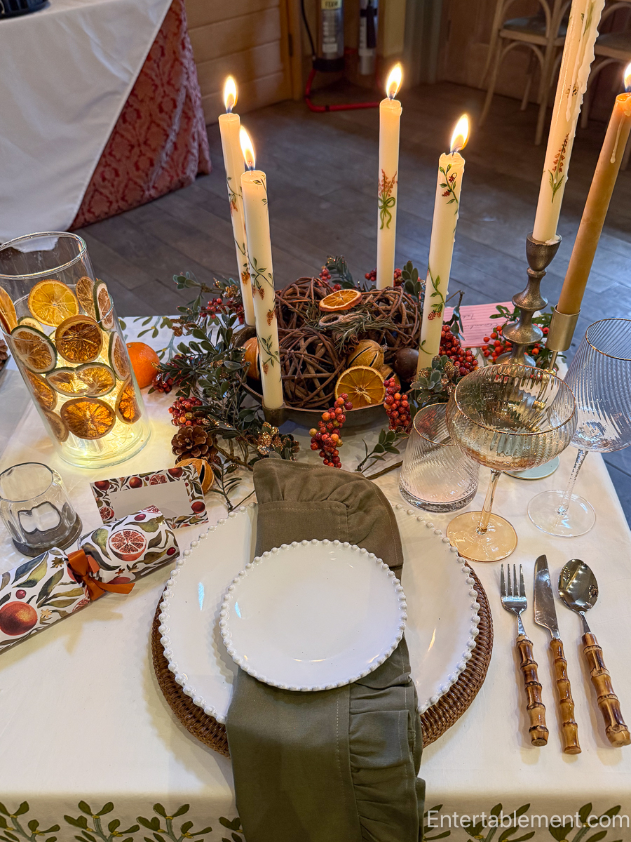 Dried citrus is very popular this year. We saw a lot of it at the Christmas Markets we visited at Chatsworth and Blenheim (more on that in a future post over at Entertablement Abroad). Here, Sarah placed dried orange and lime slices between two glass vases, inserting a strand of battery-operated Christmas lights inside the inner vase. And note the hand-painted candles, available from Stephanie at Etsy.