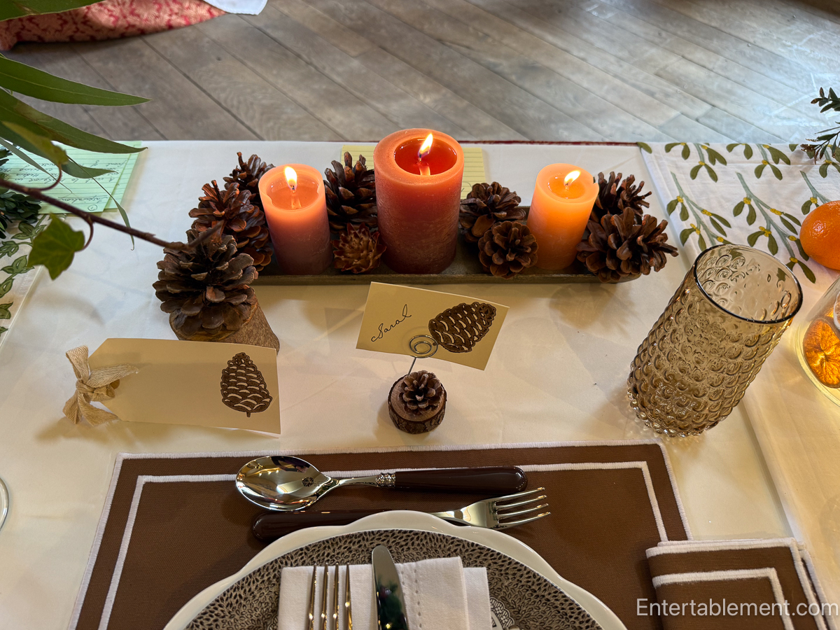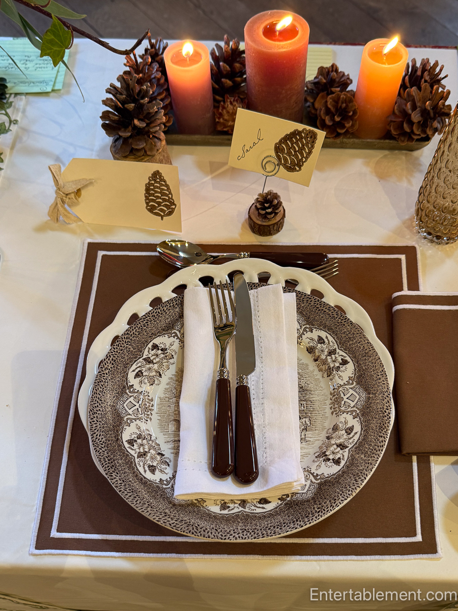 Each table told a story. One, dressed in woodland tones and brown transferware, evoked a quiet forest walk.