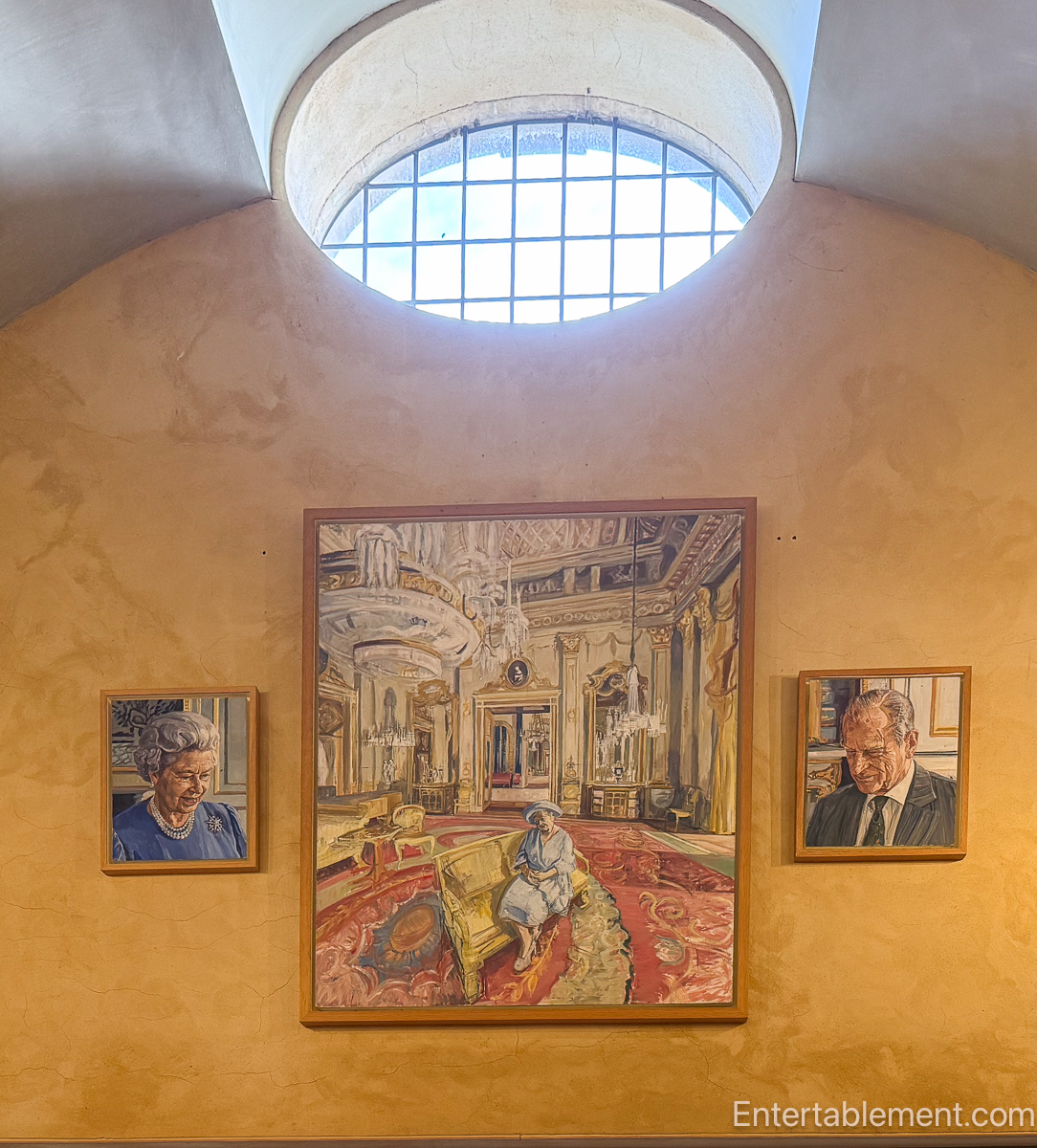 High on the walls of Orchard House are a series of portraits painted by King Charles himself. Loosely rendered and deeply personal, the paintings included family members and royal interiors, captured with painterly affection rather than pomp and circumstance. It was easy to recognize Queen Elizabeth, the Queen Mother, in the large central painting, flanked by Queen Elizabeth II and Prince Philip.