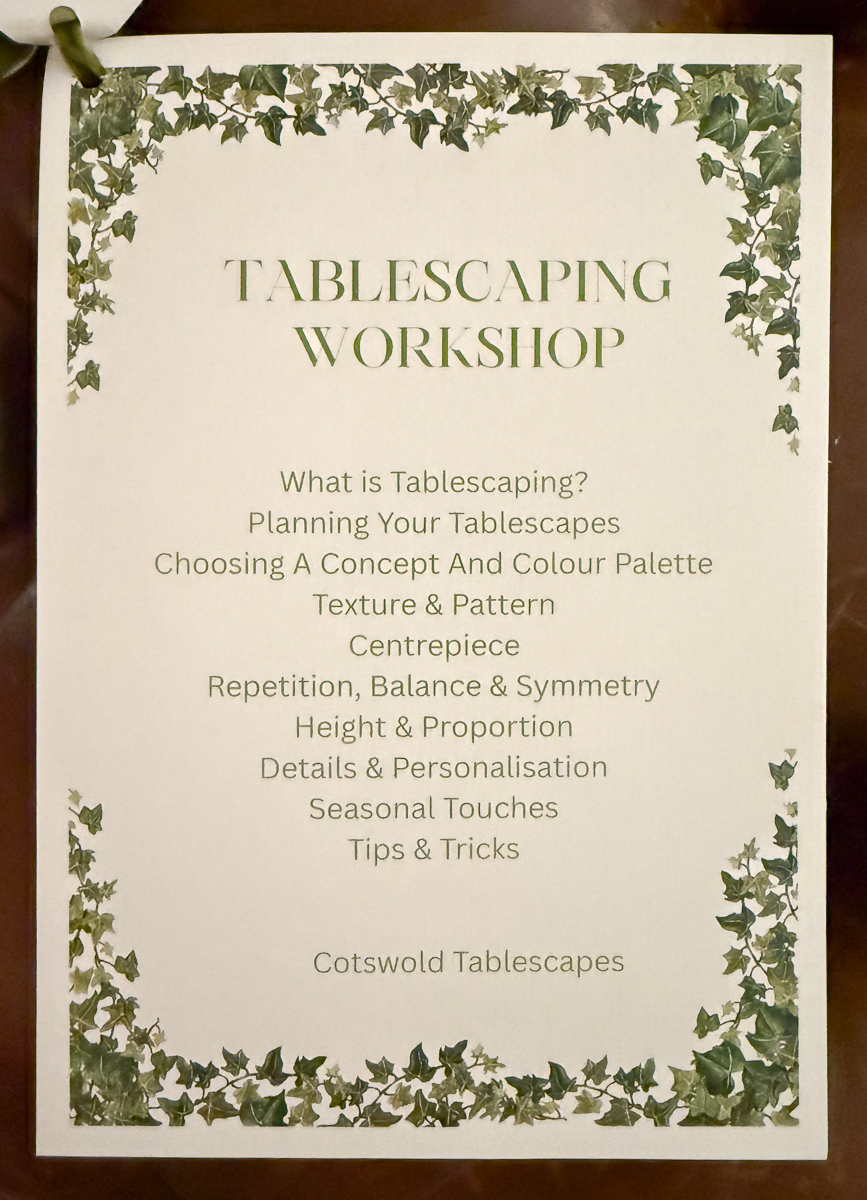 The tablescaping portion of the workshop was led by Sarah Fenwick of Cotswold Tablescapes. She spoke warmly and well of all the elements that go into a memorable tablescape. Her particular focus is nature-inspired, or garden-themed settings—something I can get right behind.