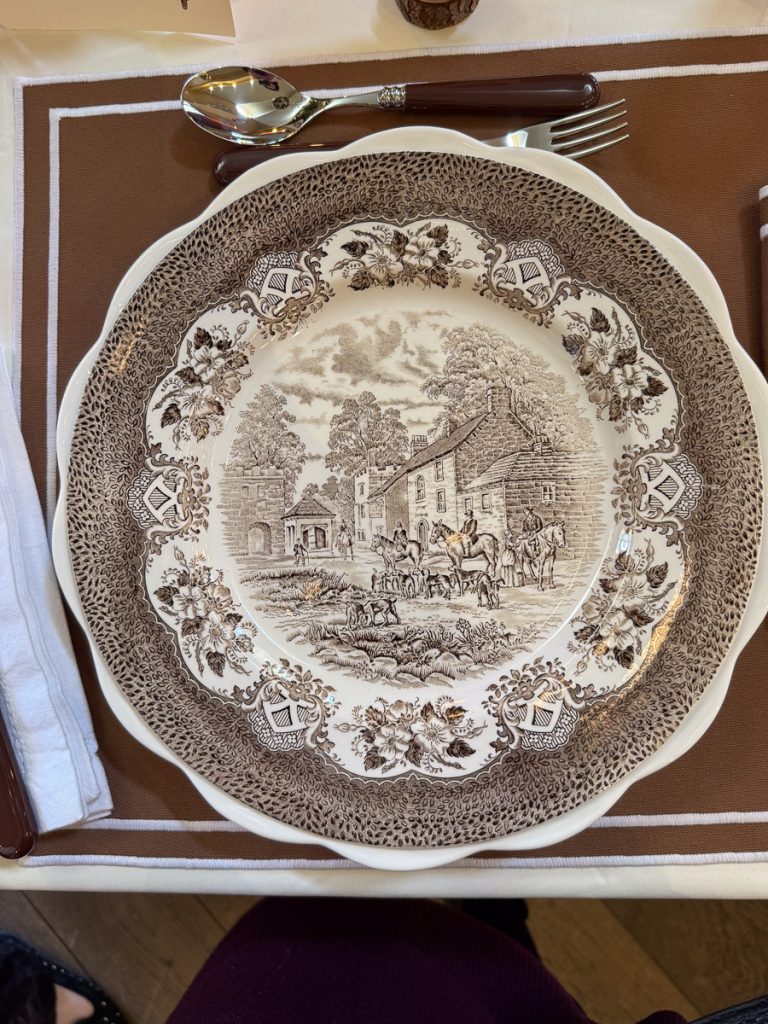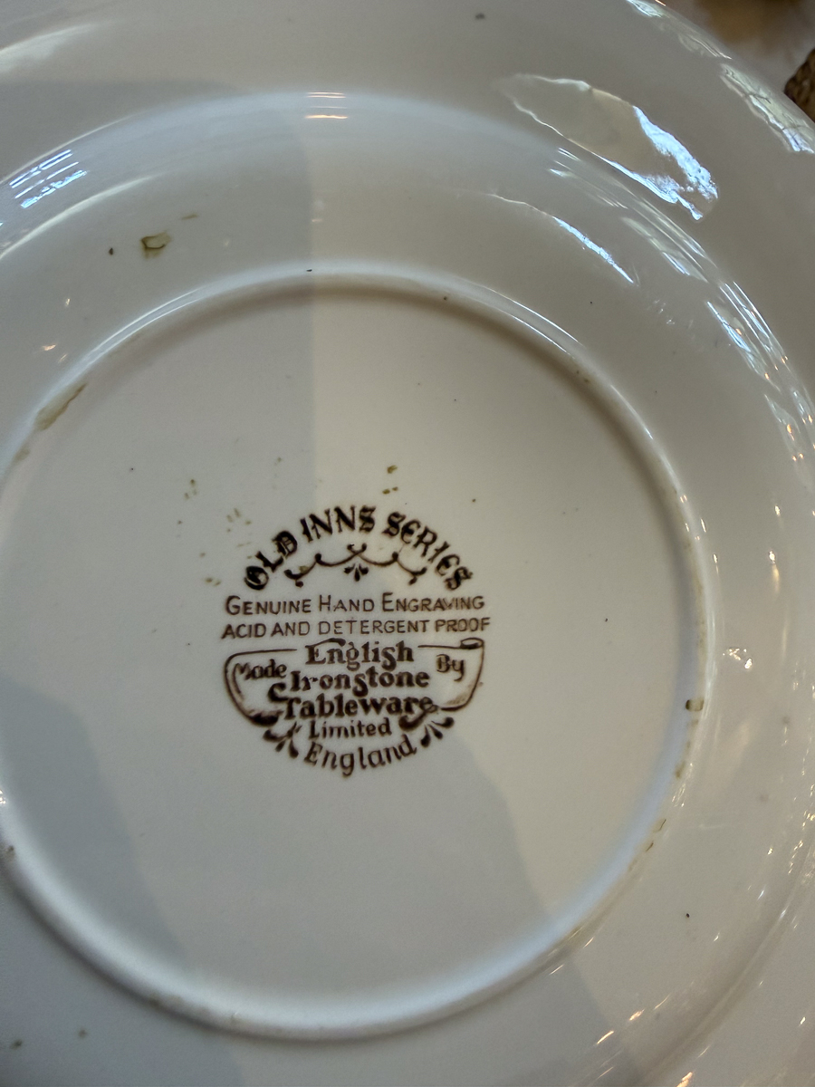 At the first opportunity, I checked for the manufacturer, and sure enough, it’s a modern take on a traditional coaching inns theme. Sarah spoke about how often she buys her tableware at thrift shops.