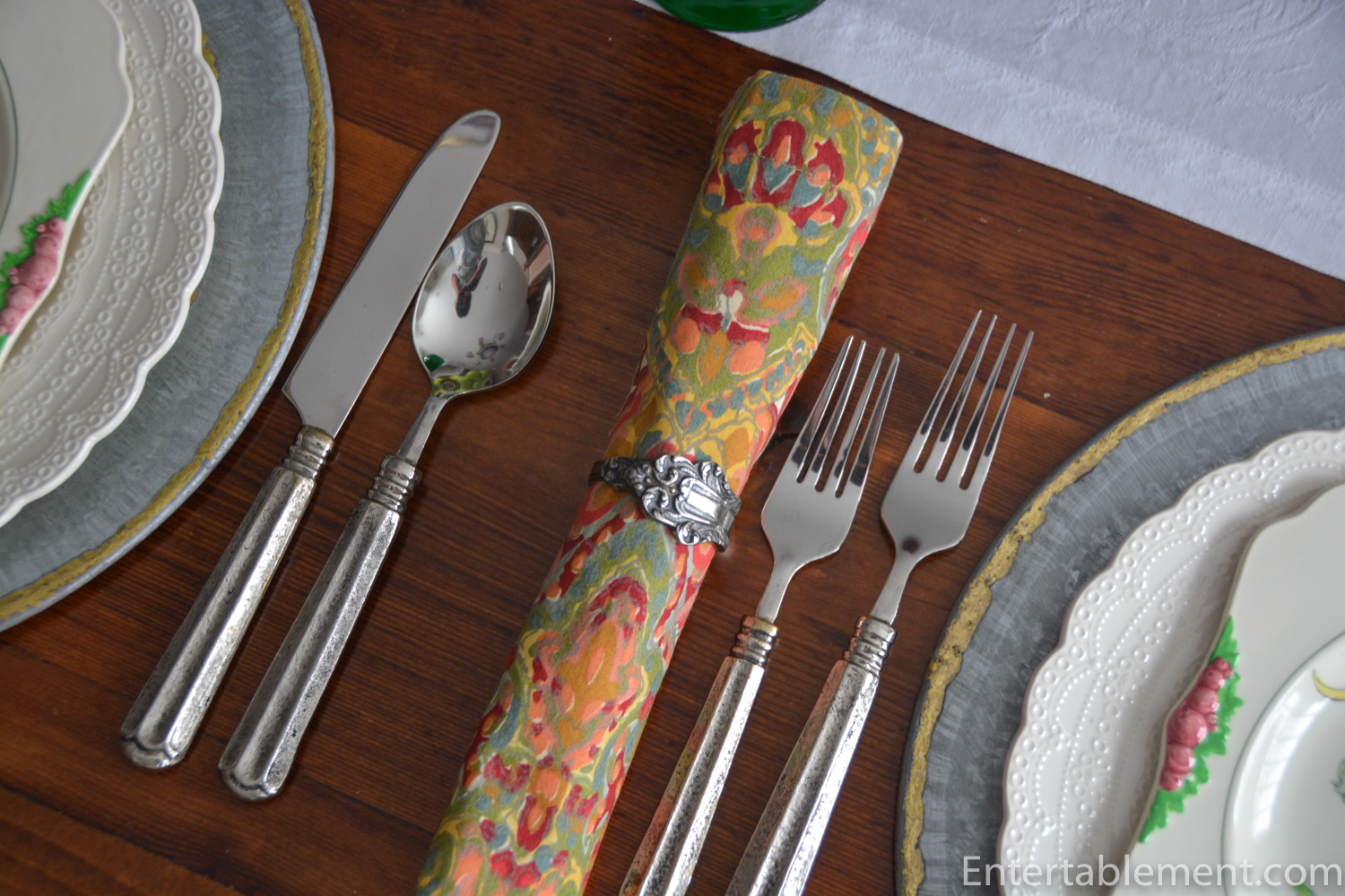 Back to our table: to highlight the poppy plates’ natural charm, I employed Spode Jewel creamware dinner plates as the base. They’re from the same era, although Jewel had a much longer production run (1926-1975). The green glassware — goblets and bowls— is also from Elise’s collection.
