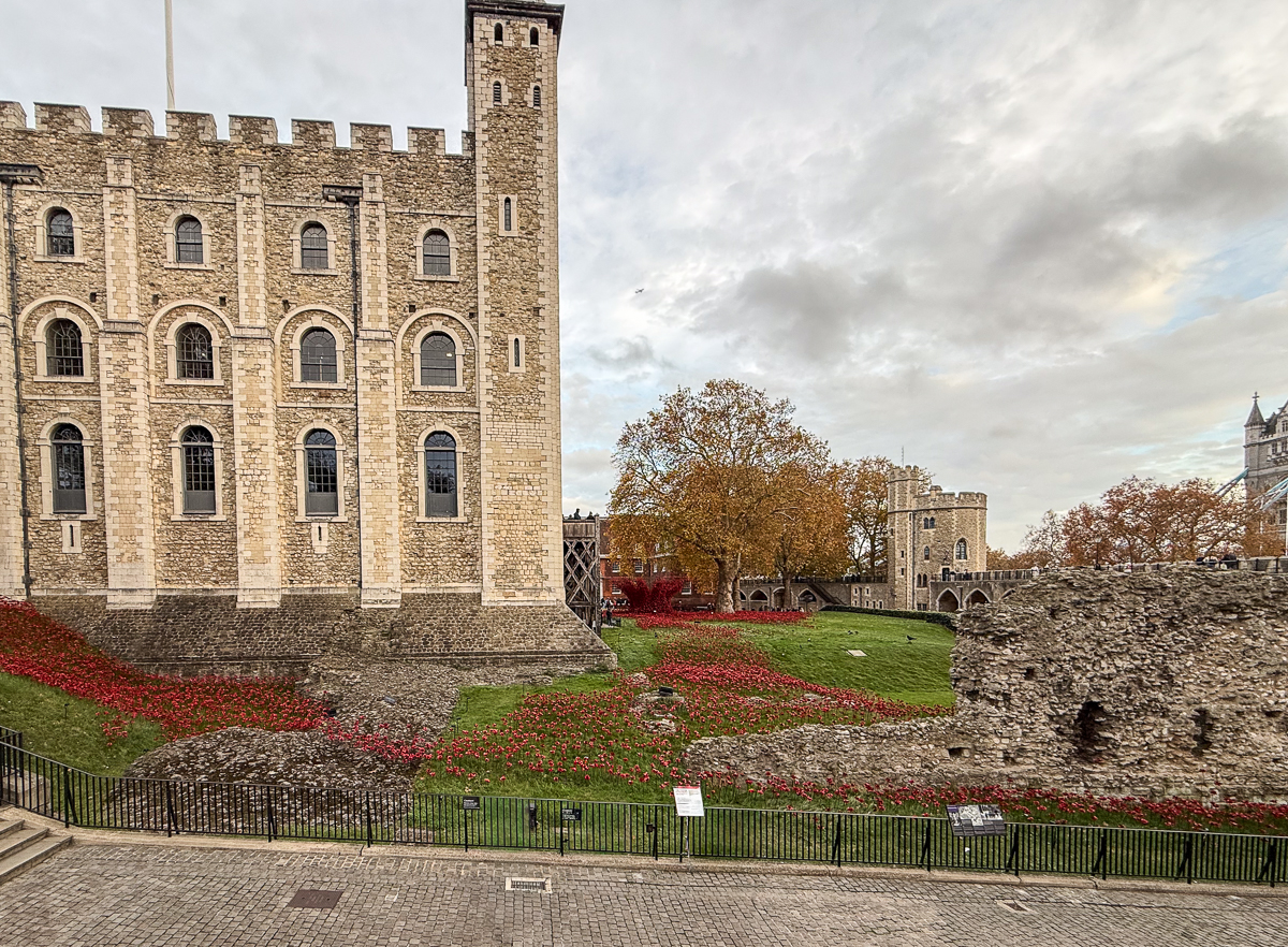 The specially commissioned installation resembles a ‘wound’ at the heart of the Tower, which was itself bombed during the Blitz. Poppies pour across the lawn overlooked by the ancient White Tower, where the blood-red flowers form a crater, with ripples flowing outwards.