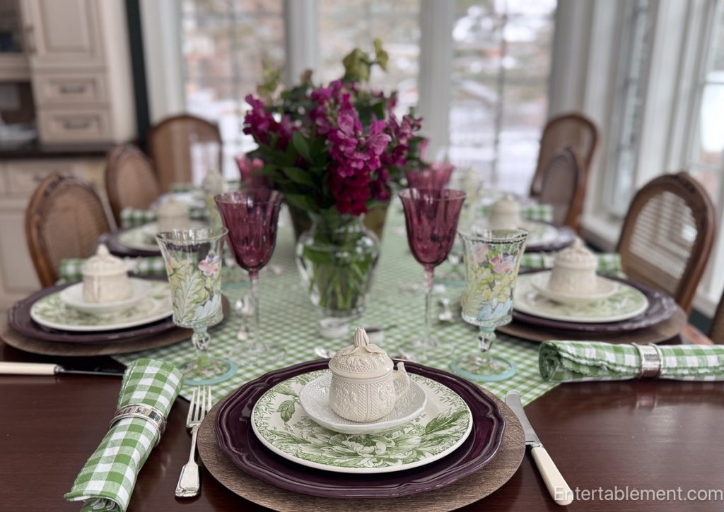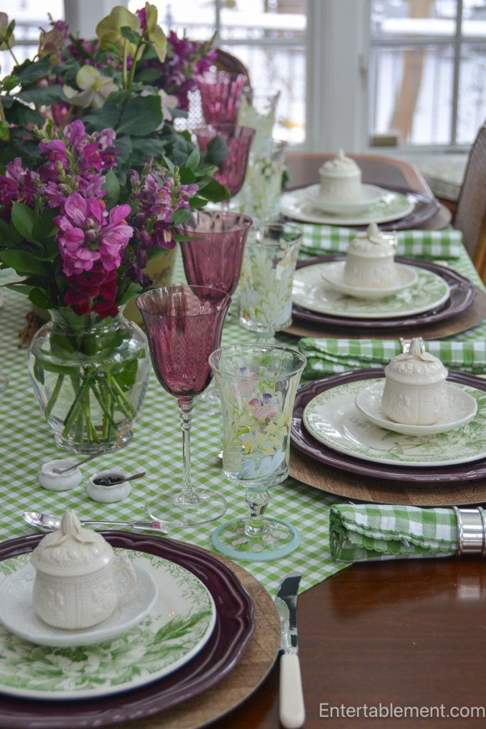 The glassware was assembled over time. The floral water glasses are from Bowring years ago, chosen primarily for the pansies. The purple goblets were thrift shop finds.