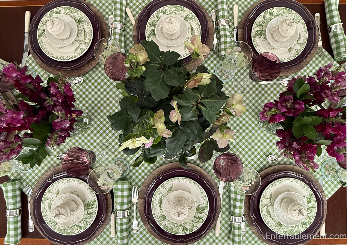 Underfoot is a green gingham tablecloth — cheerful, forgiving, and endlessly practical. It sets the tone immediately: this is a table to use, not fuss over.