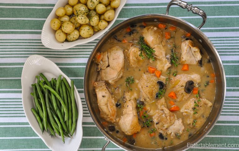 A French bistro classic with tender chicken, sweet carrots, and a deeply savoury wine-braised sauce. Served alongside buttery small potatoes and crisp French green beans, this comforting meal is a culinary port in any winter storm.